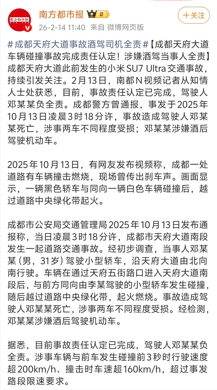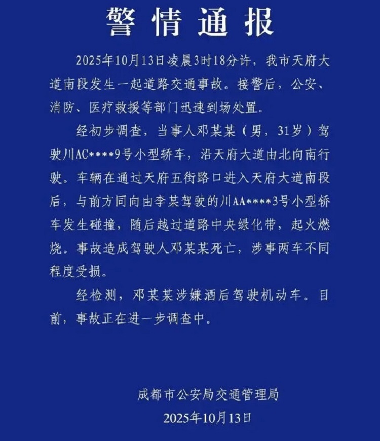 时间拨回至2025年10月13日凌晨3时18分许,成都市天府大道南段。31岁的邓某某驾驶一辆小米SU7 Ultra小型轿车,在通过天府五街路口后,与前方同向由李某驾驶的小轿车发生碰撞,随后车辆失控,越过道路中央绿化带并起火燃烧 。事故导致驾驶人邓某某当场死亡,两车不同程度受损。