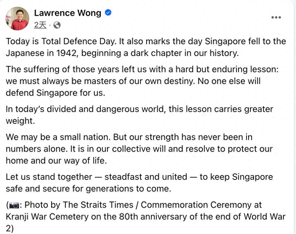 2月15日,是新加坡“全面防卫日”。1942年的这一天,日本攻陷新加坡,并对新加坡开始3年多的统治。新加坡总理黄循财在社交媒体发文,称这一天“开启了我们历史上黑暗的一页”,这一历史教训对新加坡来说意义重大。