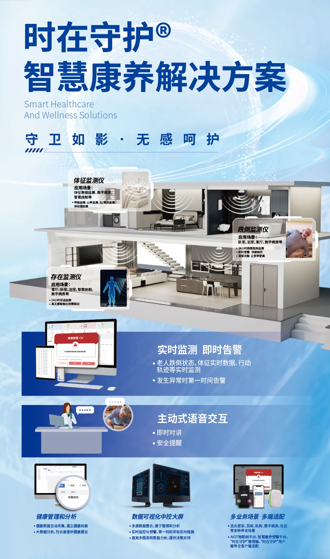 在现场展示中,旷时科技展示了“时在守护智慧康养解决方案”涵盖的多个核心板块:实时健康监测、即时告警、主动式语音交互、健康管理和分析、多业务场景多端适配等。通过毫米波雷达无感监测设备,实时收集用户的身体数据,如心率、跌倒、活动轨迹等,并借助大数据分析技术,为用户提供健康建议。一旦监测到异常情况,系统将立即多端发出告警信息,确保用户能够在第一时间得到及时的救助。