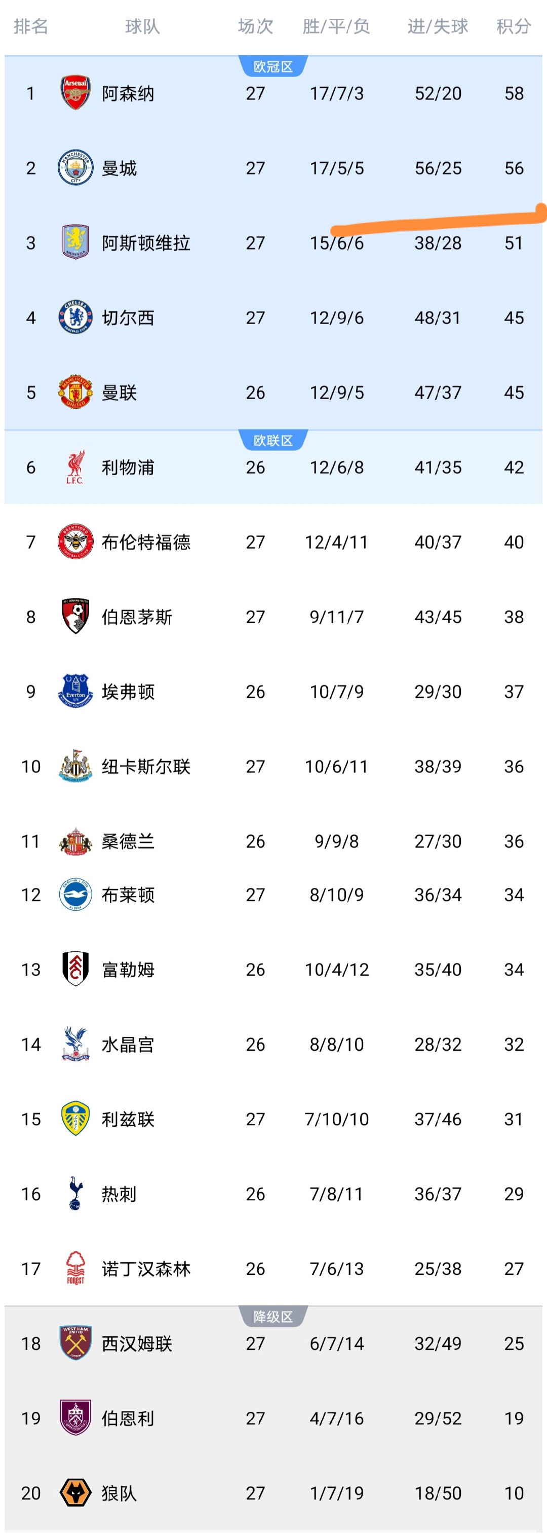 可以看到曼城击败纽卡之后,积分上涨到了56分,已经追到仅差第1的阿森纳队1分,而维拉遭利兹联逼平之后,积分仅上涨到51分,落后榜首的阿森纳7分,可以看到维拉慢慢掉队,而曼城依然强势逼近榜首,曼城看到了夺冠的大希望,阿森纳此刻会不会瑟瑟发抖呢?可以说英超争冠真正进入了白热化阶段,阿森纳自己不争气,使得冠军悬念重起啊。