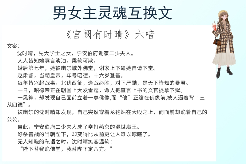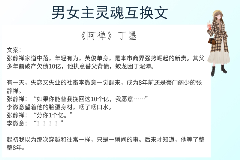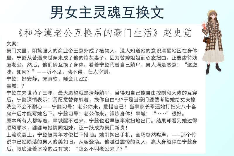 哈喽,大家好,这里是陌离小说!今天给大家带来的是6本6本男女主灵魂互换文,强推主角人设比较模式化不太吸引人,但是很难得都是正常人,没有什么心理阴影/伤痛过往。剧情和感情也发展都挺不错,值得一看。