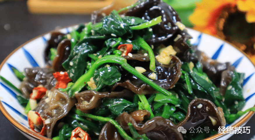 木耳泡发后清洗干净,焯水2分钟,菠菜焯水30秒,之后都挤干水分并切成段,加入蒜末、生抽和香醋,搅拌均匀即可。这道菜清爽不油腻,有助于清肠胃热毒、舒缓肝气,经常适量食用,对脸色发灰有一定帮助。
