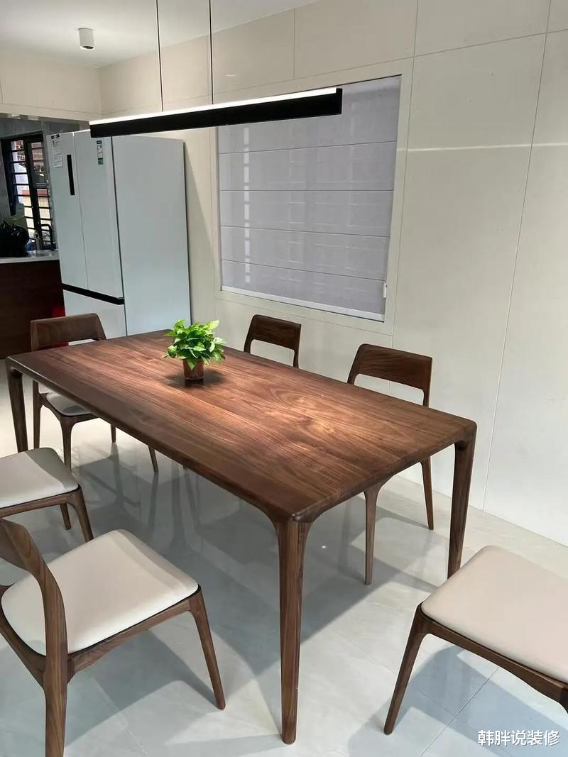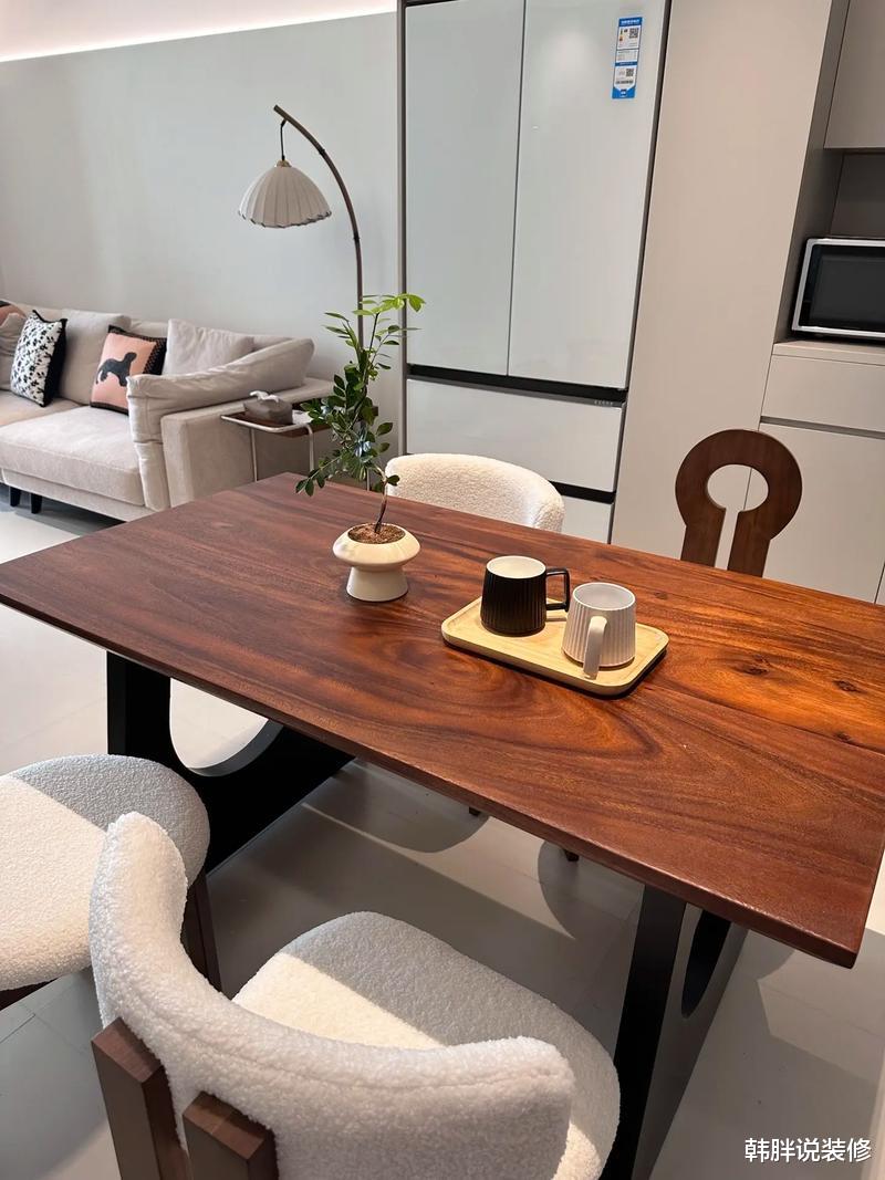 餐桌的材质:尽量选择实木的(如黑胡桃、橡木),温润耐用。岩板也行,耐热易打理。