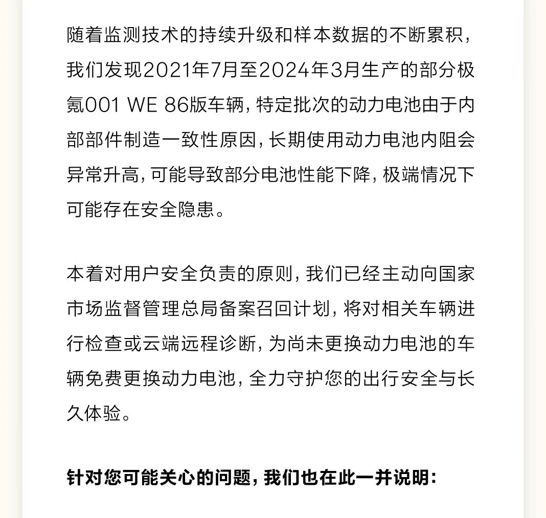 就包括这次的召回事件,恰恰证明了极氪有技术手段、也愿意负责。基于云端监测系统的技术判断,发现部分老款001ME 86版电池有问题,再到主动备案,最后给给涉及的车子免费换电池,也附带三电质保,整个过程都公开可查。