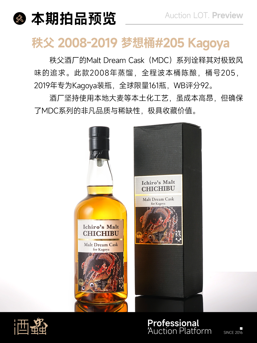 秩父酒厂的Malt Dream Cask(MDC)系列诠释其对极致风味的追求。此款2008年蒸馏,全程波本桶陈酿,桶号205,2019年专为Kagoya装瓶,全球限量161瓶,WB评分92。酒厂坚持使用本地大麦等本土化工艺,虽成本高昂,但确保了MDC系列的非凡品质与稀缺性,极具收藏价值。