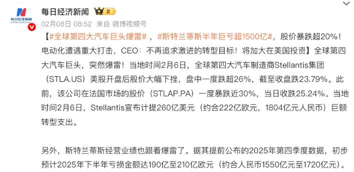 2026年2月,斯特兰蒂斯的业绩惨不忍睹,2025年下半年预计亏损190 - 210亿欧元,约合人民币1550 - 1720亿,非现金资产减值达222亿欧元,远超市场预期十倍有余。