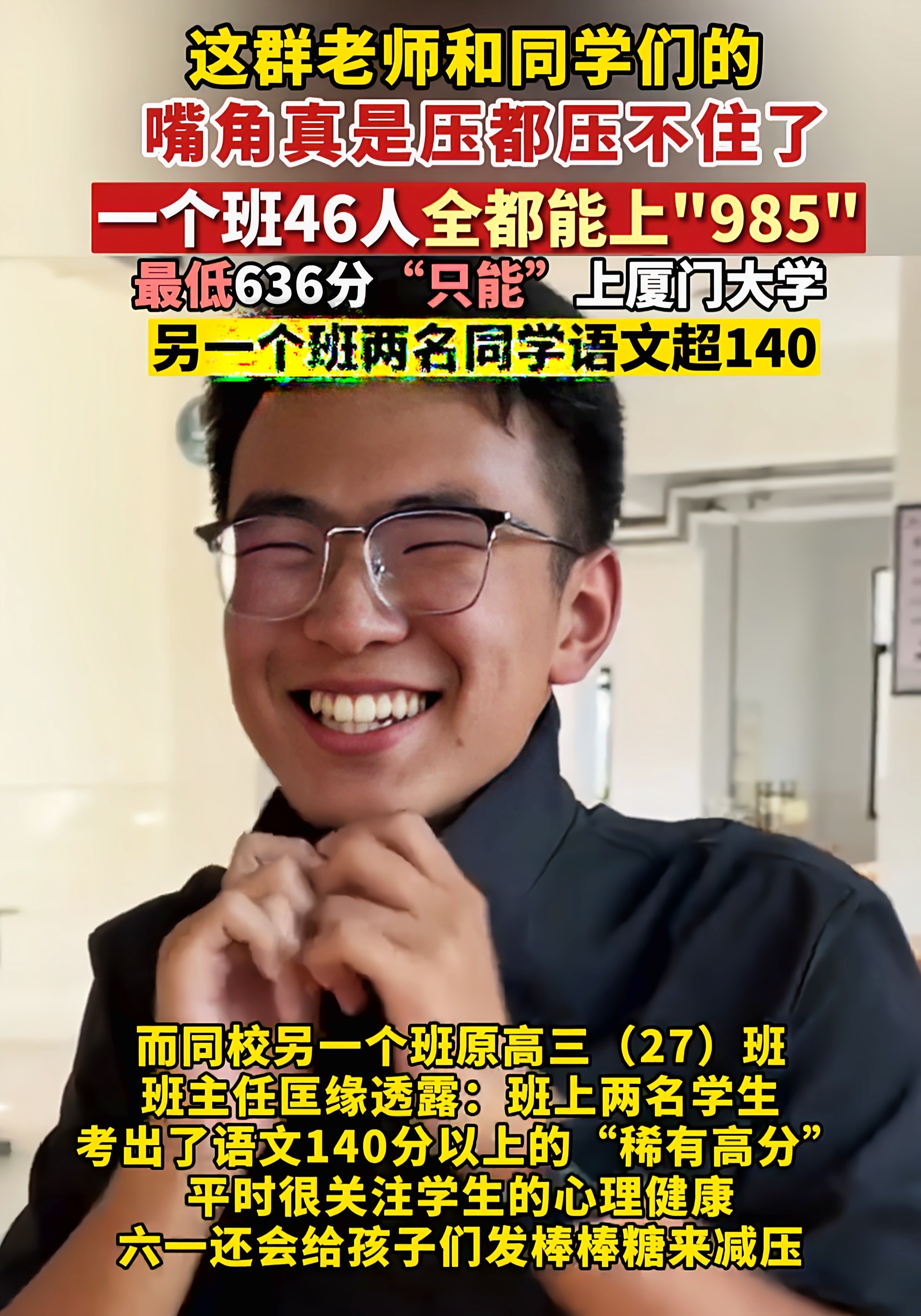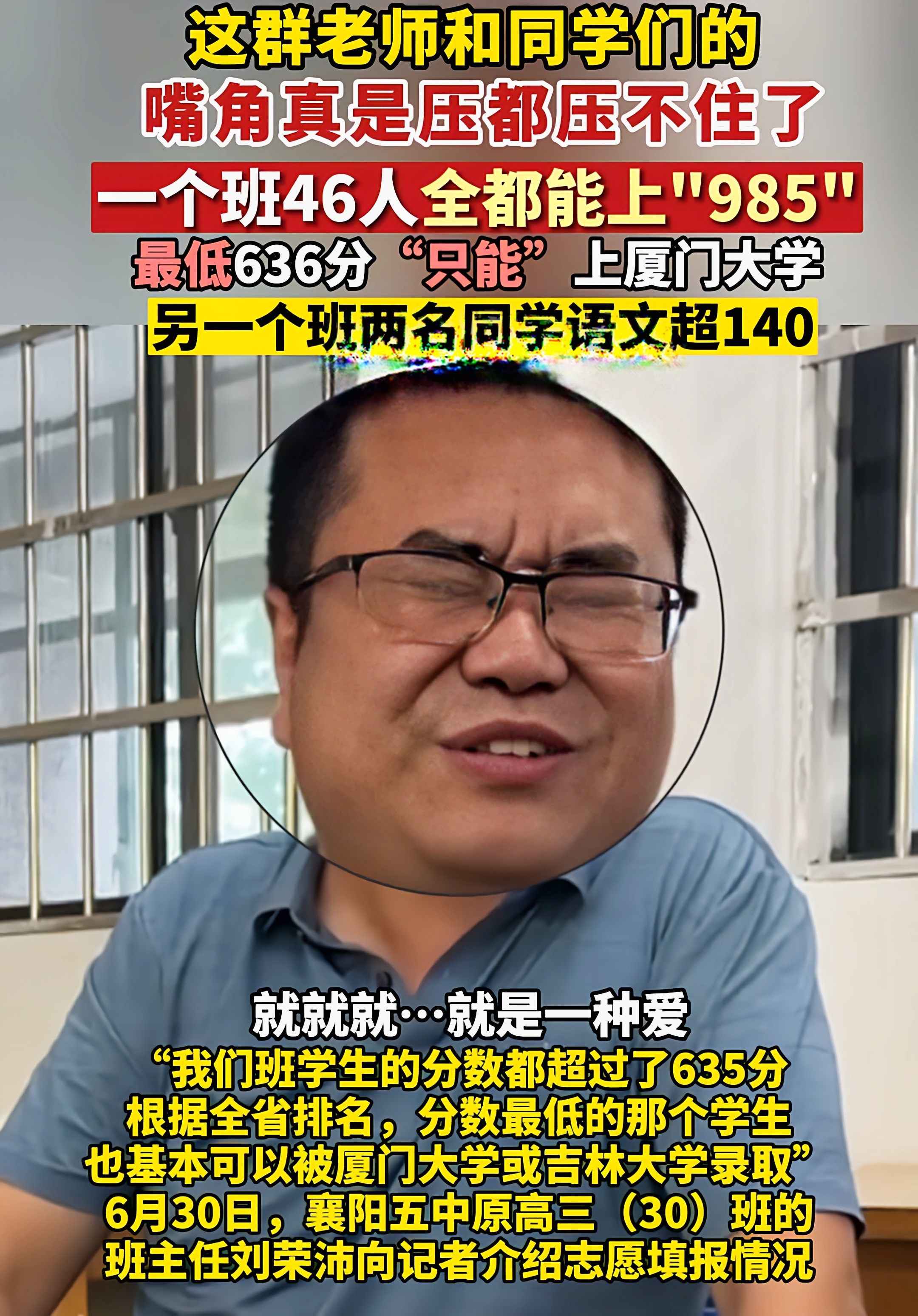 近日,襄阳五中高三班主任老师,为本班学生取得的成绩,笑得合不拢嘴