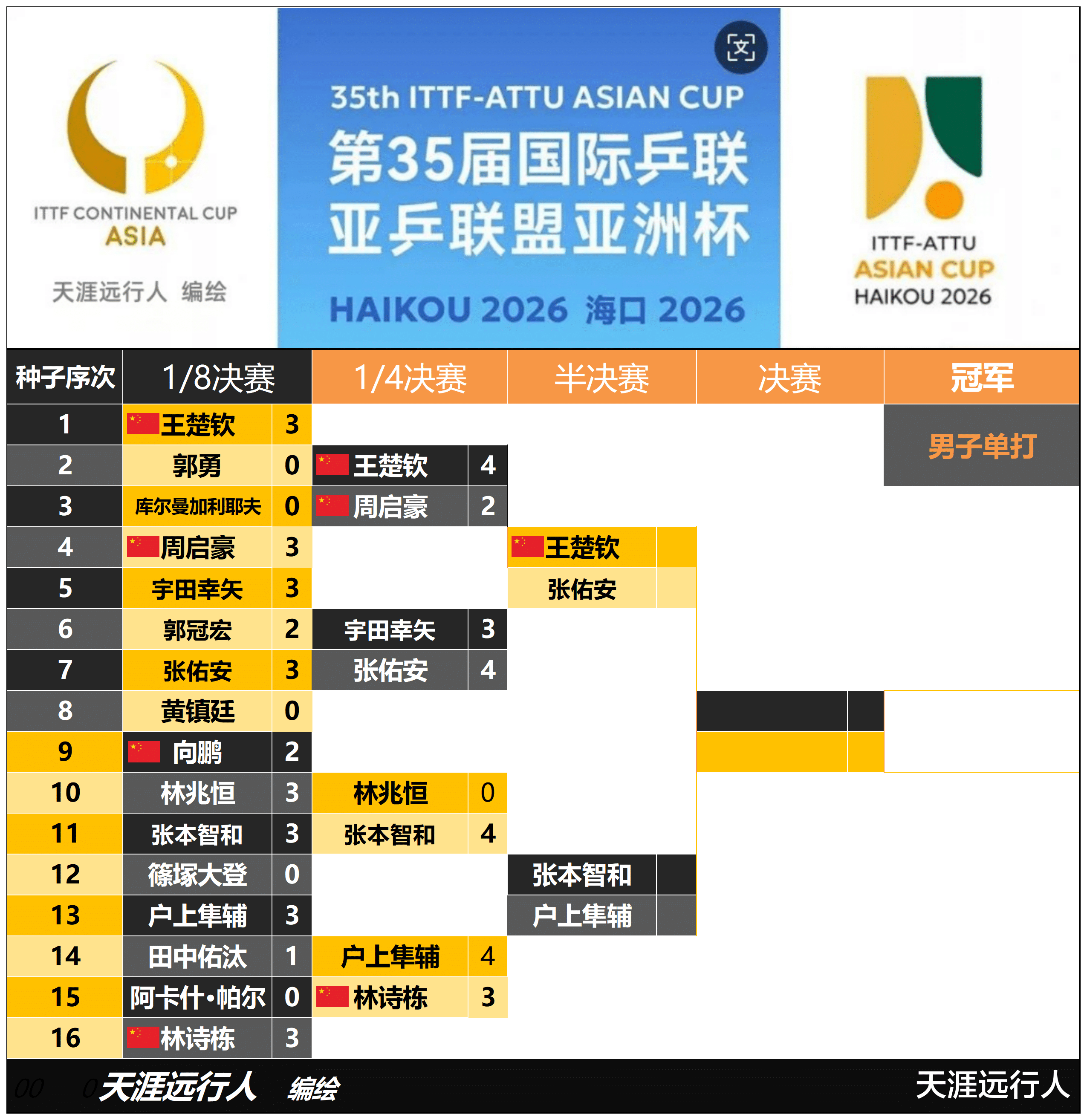 中国台北张佑安,以3-0(11-9,11-6,11-9) ,力胜刚刚拿下张本智和的香港老将黄镇廷。