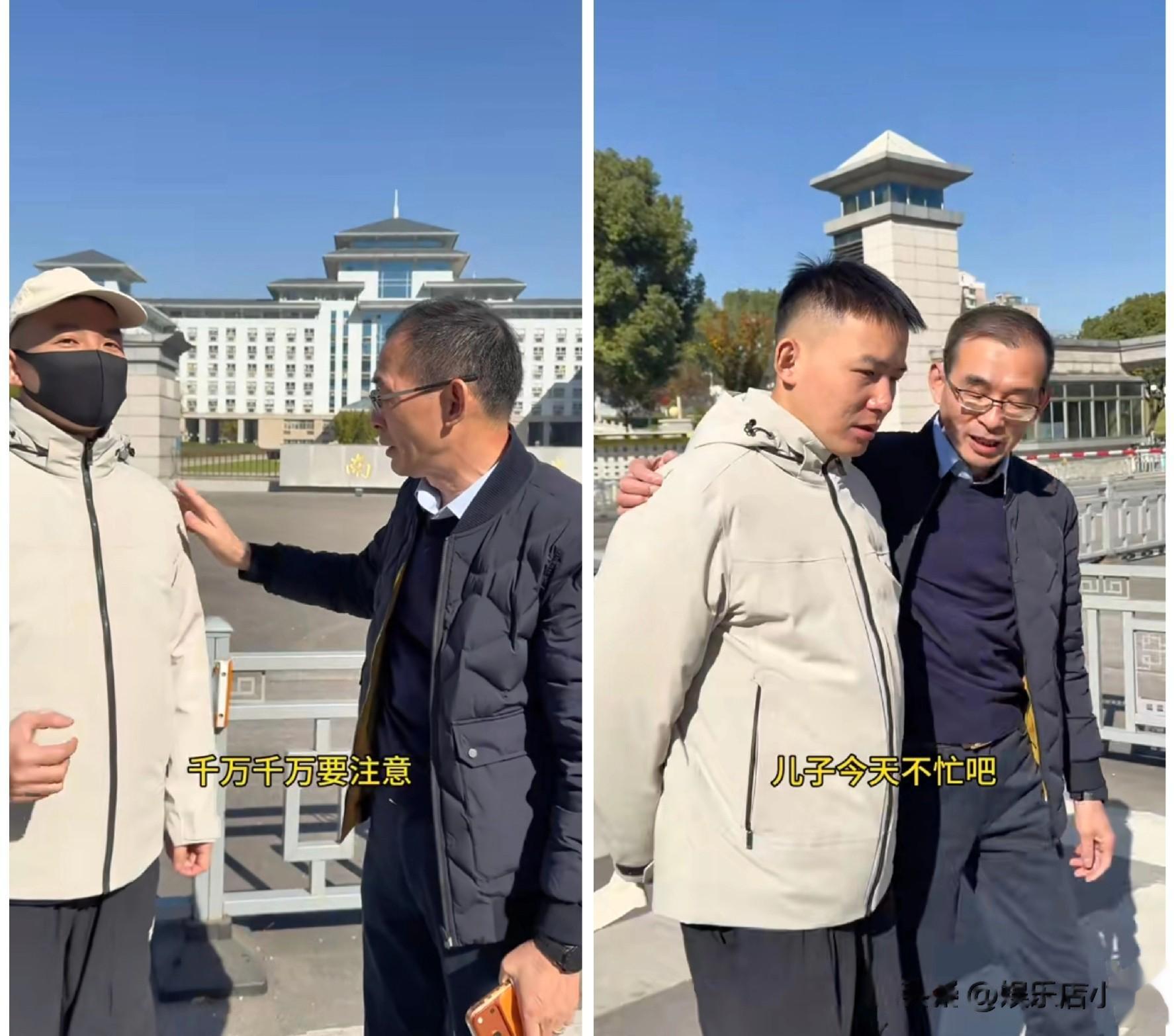 老谢在南京农业大学的门口和谢浩男相聚,刚见面,老谢便嘘寒问暖,就怕宝贝儿子着凉,还特意买了一件厚的外套准备着。