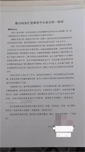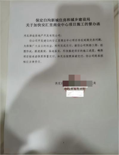 交房逾期数年 单方调期引业主强烈异议2025年9月10日,泽途地产通知业主,将交房时间调整至2026年12月30日,仅表示会提前一周通知具体安排,此举再次引发业主不满。据悉,该项目自2020年便进入断续施工,2023年曾因资金链断裂全面停工。而在此期间,销售活动仍进行正常宣传推进。后经白沟新城住建局多次约谈督促,于2025年5月13日复工,但进度仍未达预期,按当前节奏难以完成2026年底交付目标。
