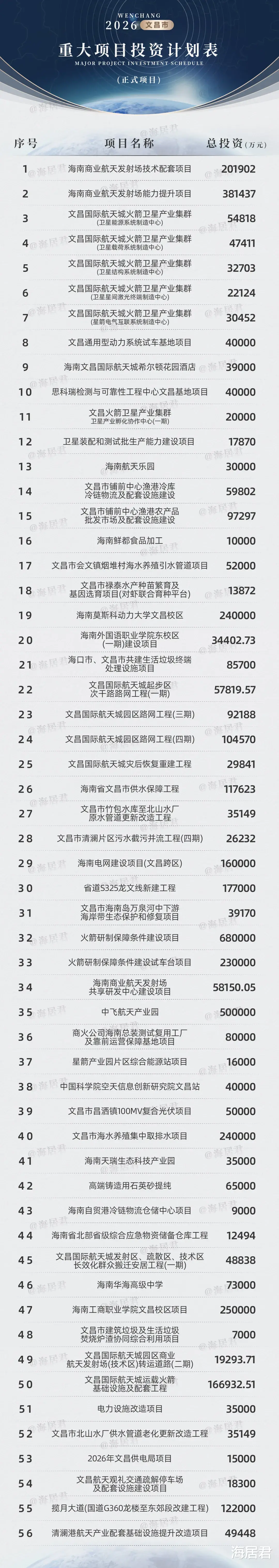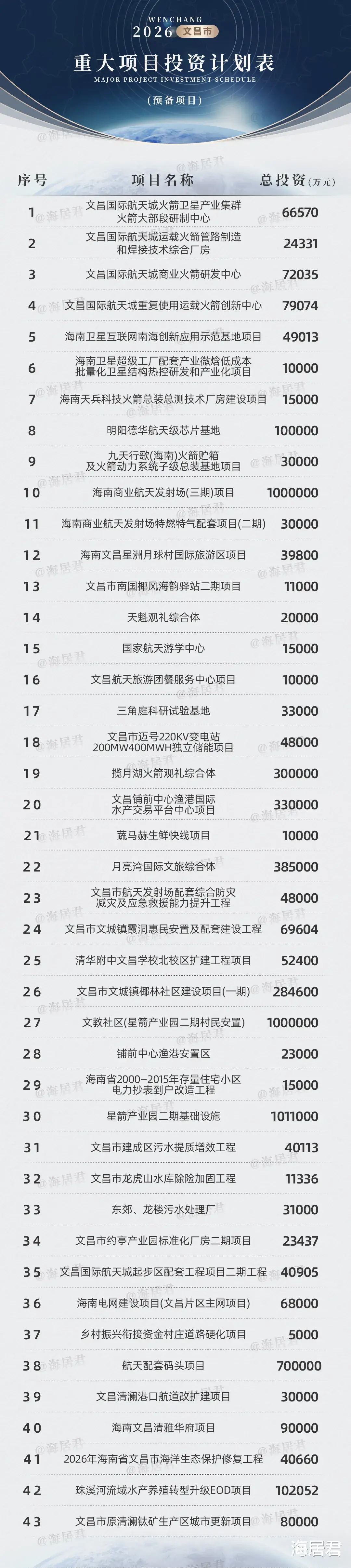 文昌市也已经公布2026年重大项目投资计划,共99个项目,总投资1169亿元,包括56个正式项目,总投资524.6亿元;43个预备项目,总投资644.4亿元。