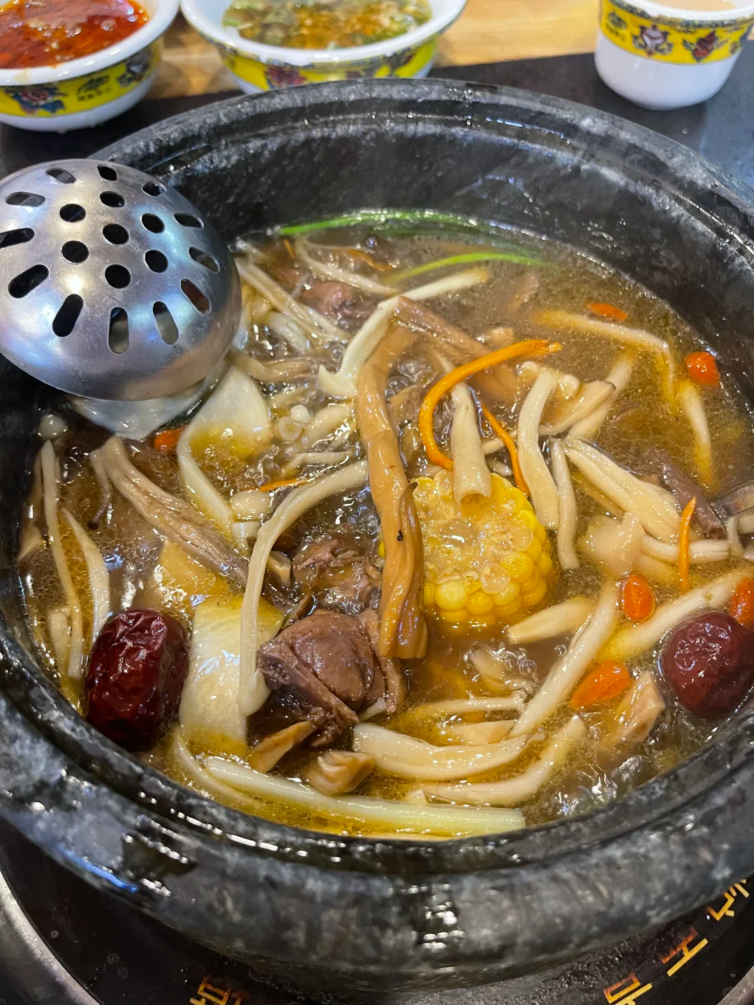 放入菌菇:加入准备好的菌菇,继续小火煮 20-30 分钟,直至菌菇熟透,鸡肉酥烂。
