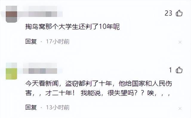 不少人纷纷在评论区进行留言,觉得事情没那么简单,毕竟在很多人看来,有人掏鸟窝都能被判10年,反观李铁涉嫌那么大的金额,却只被判了20年,实在是意难平。