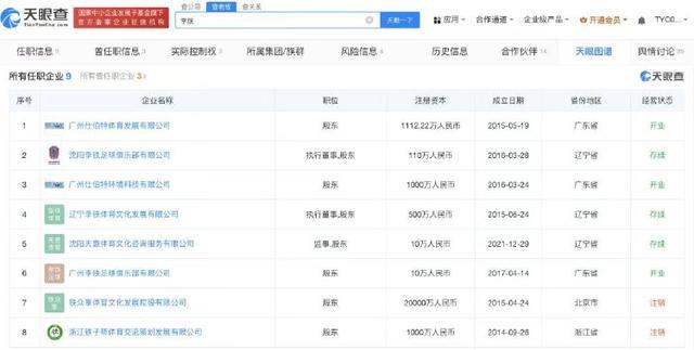与此同时,李铁还有6家与足球有关的公司,这也是他强劲的商业版图,不管是球员、球场还是运营等这些都涵盖其中。