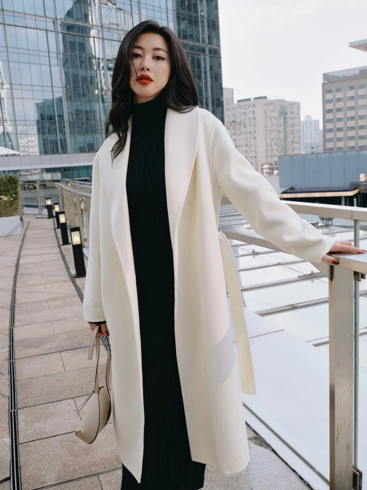 内搭选择全黑针织套装,与米白色形成 “一浅一深” 的经典对比,色彩上严格控制在两种色调,仅用浅米色手包作为过渡,让整体造型在简约中透着层次感。尖头裸色高跟鞋进一步拉长腿部线条,与大衣的浅色系形成呼应,有利于优化比例。