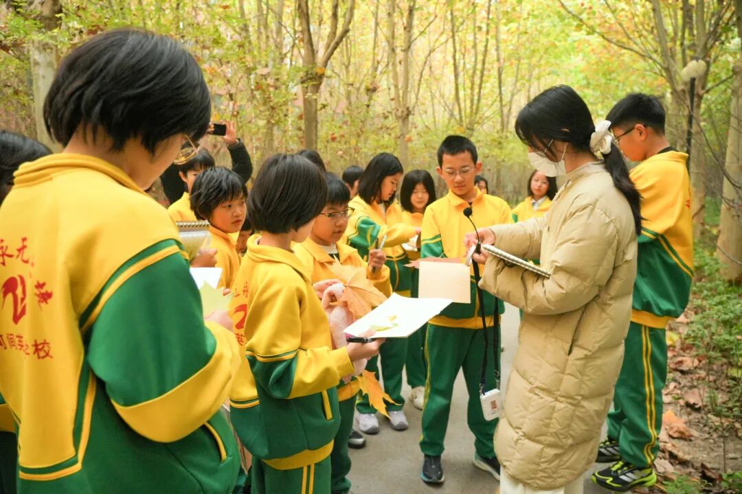 每一片叶子都藏着秋天的悄悄话,被孩子们小心翼翼地收进 “自然素材库”。在一片铺满落叶的空地上,同学们围成一个圆圈,目光齐刷刷地投向中间的老师。