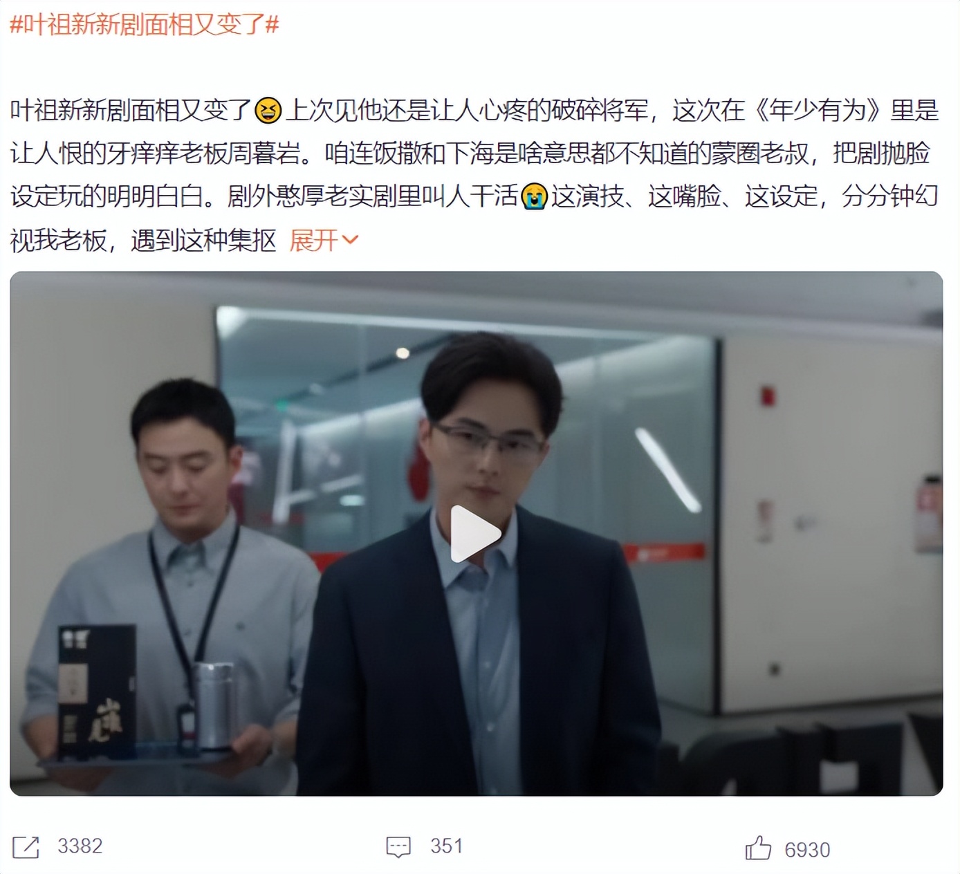 在《年少有为》中,他化身“反派”,将观众们气得牙痒痒,毕竟他出演的周暮岩,就是我们老板最真实的样子,正因如此,网友们表示:叶祖新的面相都变了,果然演技派就是演技派,这绝对是演什么就像什么。