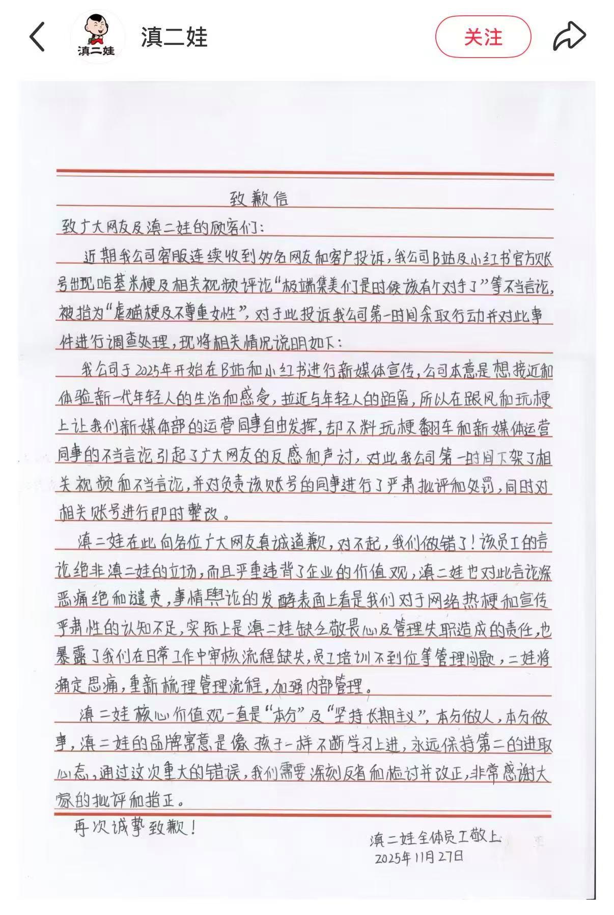 据极目新闻报道,近日,零食品牌“滇二娃”因其B站及小红书官方账号发布含虐猫梗、不尊重女性的相关言论,引发网友广泛反感与声讨。11月27日晚,该品牌发布手写致歉信,承认言论不当,宣布下架相关内容、处罚涉事人员并启动账号整改。