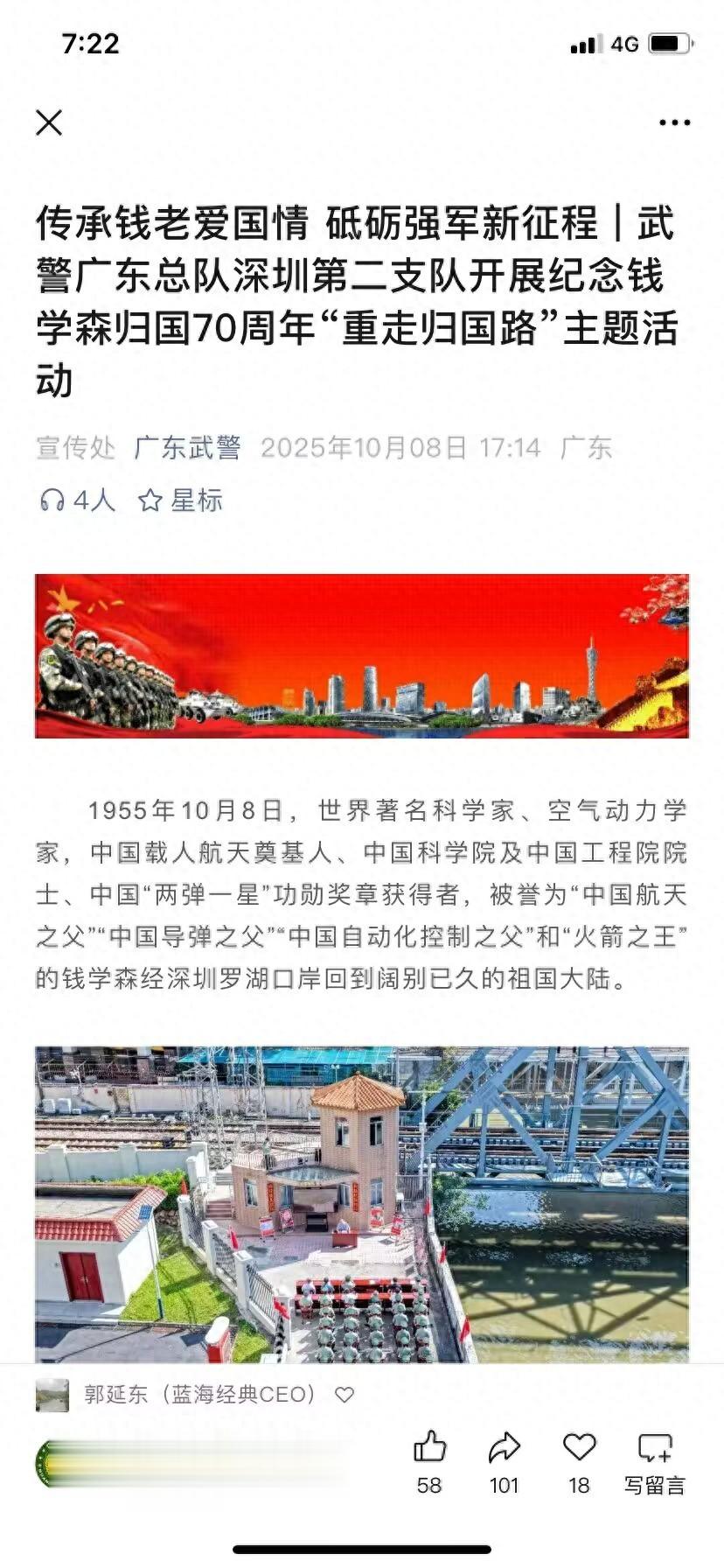 非常荣幸,笔者今天有机会参加钱学森归国70周年纪念活动。在深圳罗湖口岸,当年钱学森老爷子亲自走过的那条铁路,罗湖口岸全体武警官兵,都参加了本次纪念活动。