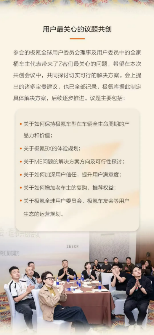 不知道大家还记不记得,今年9月极氪在丽江开了一场“全球用户委员会-理事共创会”,由吉利集团副总林杰亲自带队,研发、售后、用户运营的高层管理都参与了,当然,这次见面不只是听用户意见这么简单,而是将品牌的现状,以及企业的诚意表达清楚。