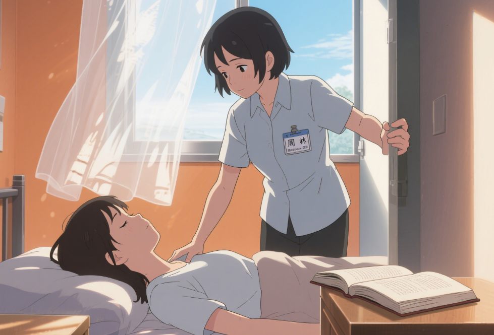 接着是翻身、按摩,指腹按压过她日渐萎缩的肌肉,从肩颈到脚踝,一遍又一遍,对抗着僵硬和可能到来的褥疮。力道要适中,轻了无效,重了怕伤着她毫无知觉的身体。然后是洗漱。温热的毛巾,小心翼翼地拂过她的额头、眉眼、鼻梁、脸颊、下巴,避开那根维系生命的鼻饲管。她的皮肤依旧细腻,只是苍白得没有一丝血色。我会一边擦拭,一边絮絮叨叨,像对着空气,又像对着她沉睡的灵魂:“小晚,昨晚睡得好吗?外面下雨了,听着挺催眠的…楼下张婶家的猫又打架了,吵得很…茉莉今天好像又开了一朵,你闻到了吗?” 水杯里的温水,温度总是刚刚好,用来湿润她干涸的嘴唇。棉签蘸着水,轻轻涂抹在她唇瓣上,那是我一天中离她“最近”的时刻。每一次触碰,都带着一种近乎虔诚的小心翼翼。这日复一日的流程,早已刻入骨髓,成为我生命的一部分,也像一道无形的栅栏,将我牢牢圈禁在这方寸之地。窗外的鸟鸣,楼道里的脚步声,都成了遥远而模糊的背景音。