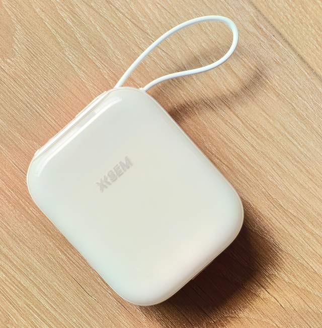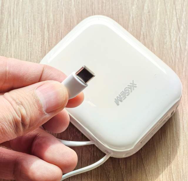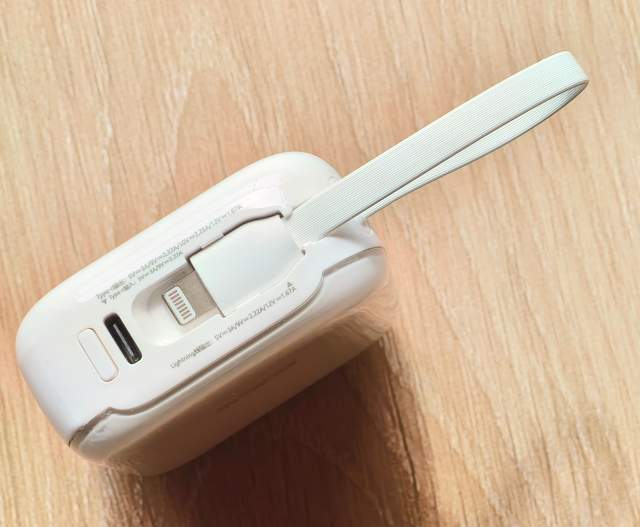 我选的是白色款,设计很简洁,边角圆润,没有任何花里胡哨的灯效。最巧妙的设计,是那根“藏”在机身里的二合一短线。轻轻一抽,就能拉出一根一头是苹果Lightning口,一头是Type-C口的短线。不用的时候,线能严丝合缝地卡回凹槽,整整齐齐。