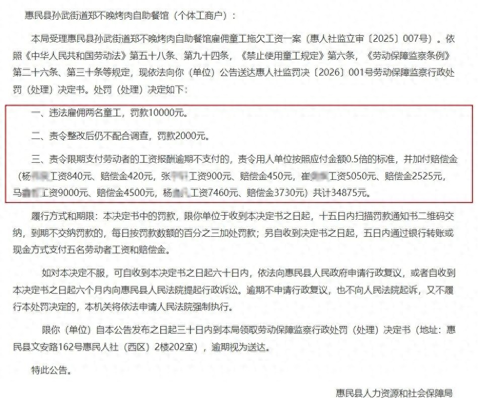 2026年2月6日,惠民县人社局公布一则《关于拖欠工资及使用童工问题行政处罚(处理)决定书公告》: