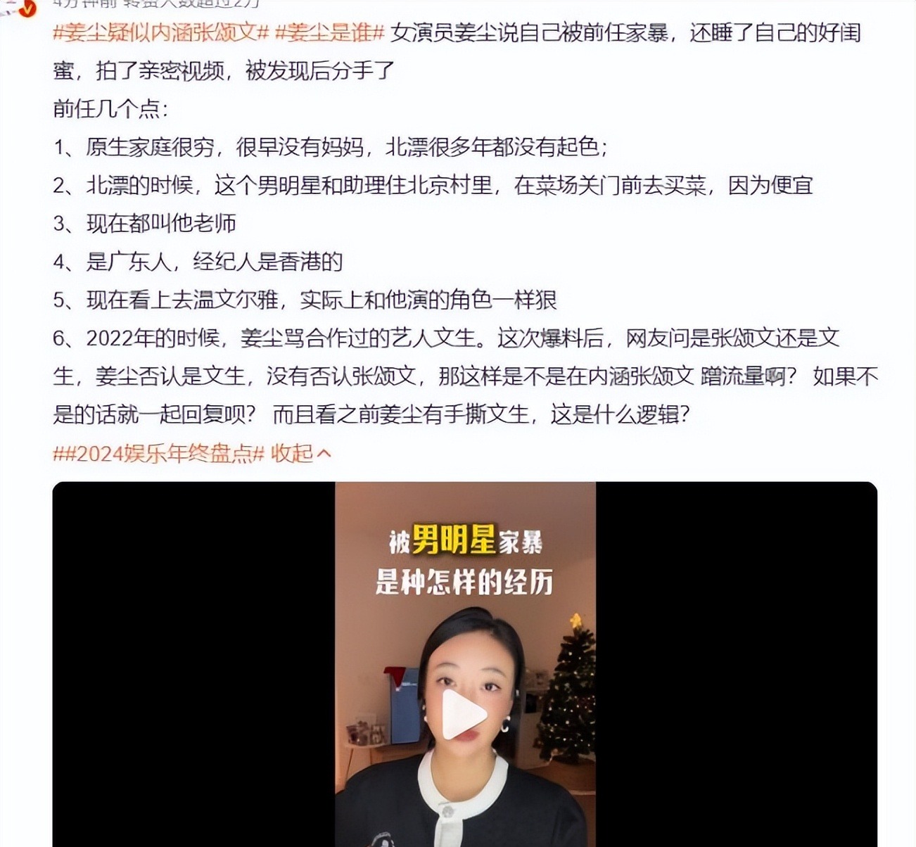 这时,一场更猛的风暴席卷而来。前女演员姜尘在社交平台上揭露了她与前男友的遭遇,包括家暴和背叛。她还提到了该男星的一些特点:他来自贫困家庭,母亲早早去世,过去为了节省开支,常在市场快收摊时购买蔬菜。