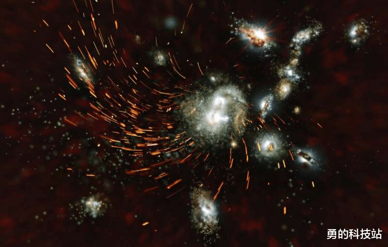 原星系团SPT2349-56的艺术家图展示了不同形状和大小的相互作用星系,以及被潮汐力撕裂并加热的橙色气体。图:N.Sulzenauer