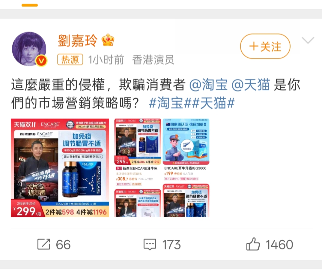 今天娱乐圈和电商圈同时炸锅了!刘嘉玲直接在社交平台开炮,喊话淘宝、天猫:“这么严重的侵权,欺骗消费者,是你们的市场营销策略吗?”这波硬刚,简直比电视剧还精彩!