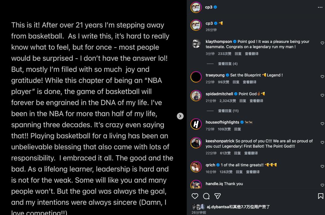 克里斯-保罗在个人社媒上发布长文、宣布正式退役,这位12届全明星、11次入选最佳阵容的“控卫之神”就此结束了漫长的廿一载征程。从初入联盟就力压“魔兽”拿下最佳新秀头衔开始,保罗作为传统一号位,以1米83的个子走出了一条属于自己的道路,生涯辗转七支球队,可以说拿到了几乎所有的个人荣誉,唯独缺了一枚总冠军戒指。