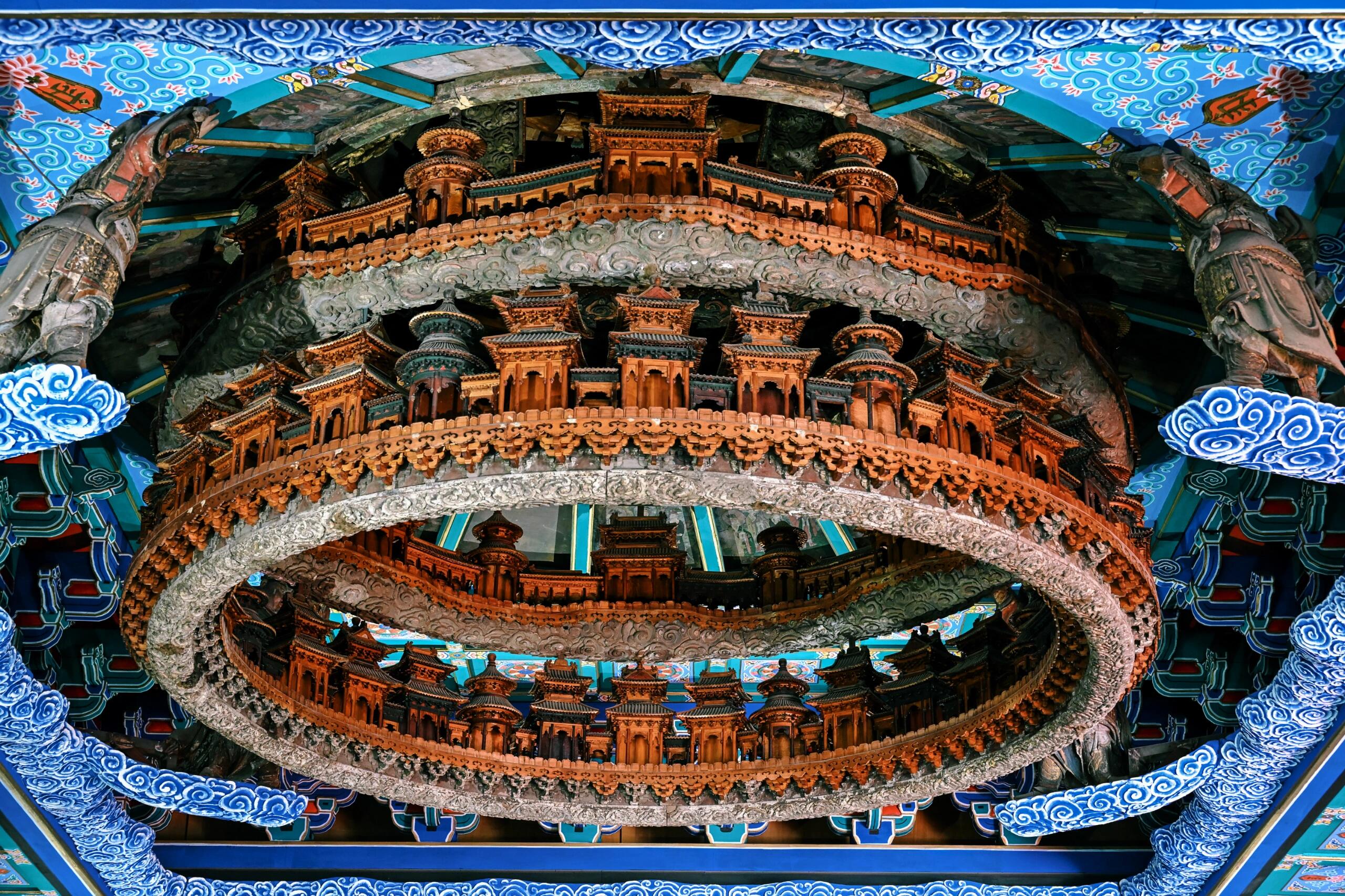 第一次仰头凝视它时,人总会下意识地屏住呼吸。不是因为它近六米的直径带来的视觉压迫,而是那层层嵌套的结构里,仿佛藏着一整个浓缩的天界。藻井从上至下共分六层,每一层的圆形主框架都细雕着云纹,那些云朵不是呆板的重复,而是疏密有致地缠绕,有的如轻纱拂过,有的似浪涛翻涌,木纹与雕痕在光线下交错,竟让人看出几分云气流动的错觉。