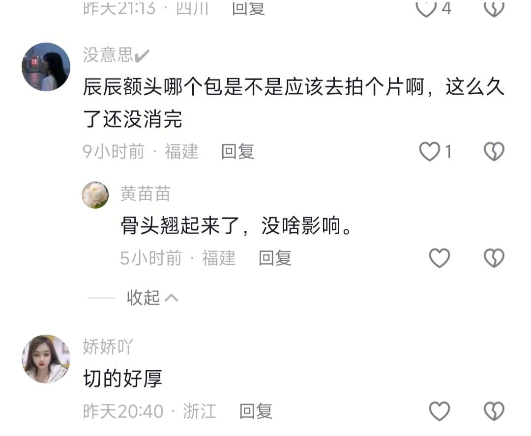 老实讲,开篇辰辰拜年的镜头,我翻来覆去看了三遍。本来想就看个热闹,结果一眼就瞅见娃额头那个包,我晕,这么久了还没消,换我我都郁闷死了。然后评论区直接炸了,有人说辰辰长了对精灵耳,别人说的,有福气的面相,娃以后肯定聪明;还有人急得不行,说赶紧带娃去拍片啊,不是吧?这都没人上心吗?还有人说终于给娃穿长衣服了,太棒了,真是操碎了老母亲的心。