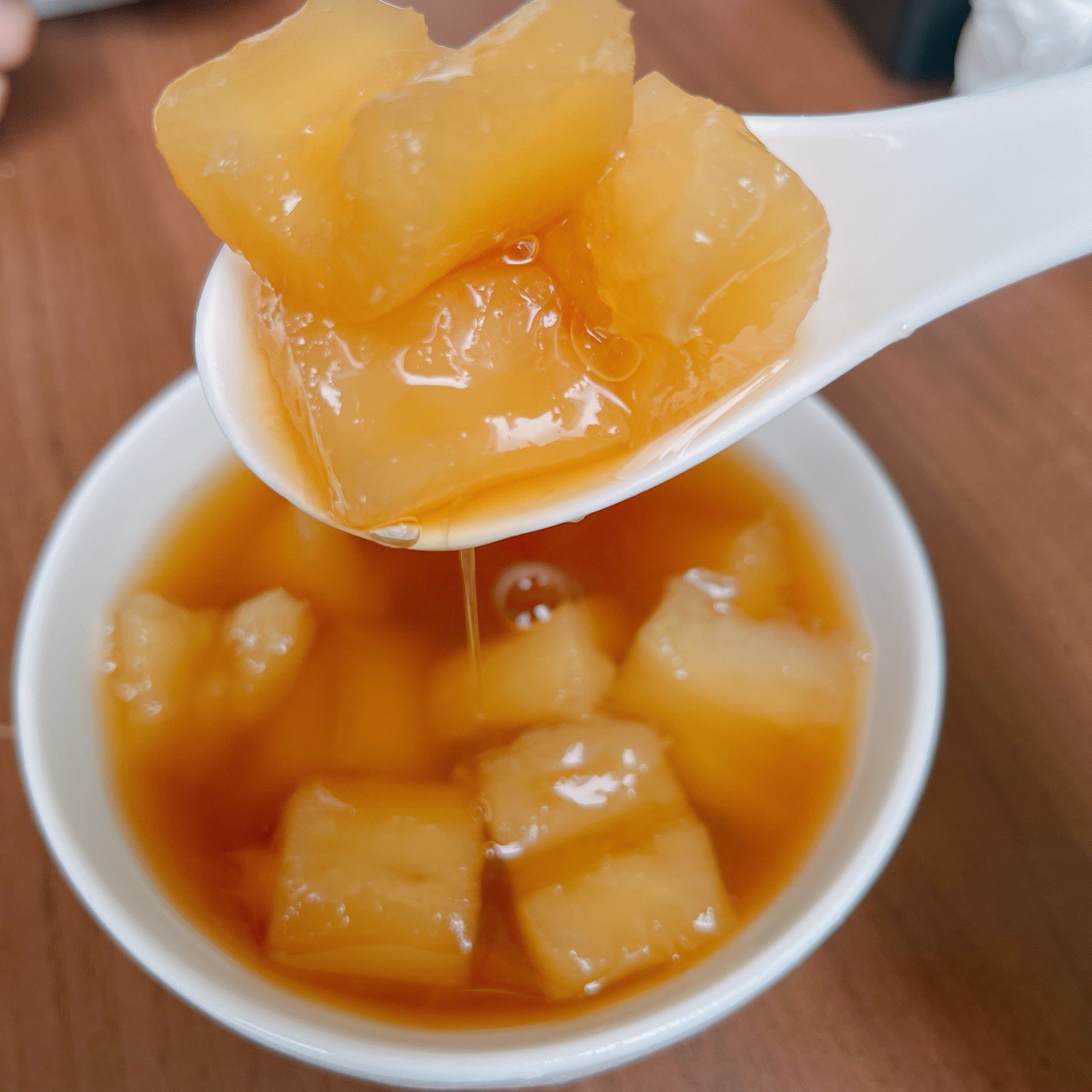 煮到位的木薯表皮略带一点弹牙,和红薯一样沙沙糯糯,但咀嚼起来比红薯更黏、更有阻力。一碗好的木薯糖水,几乎感受不到植物根茎的纤维感。