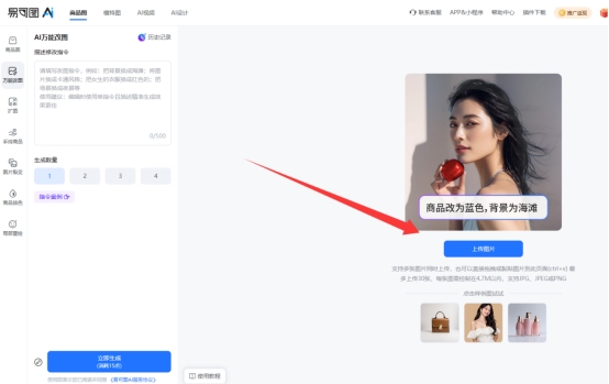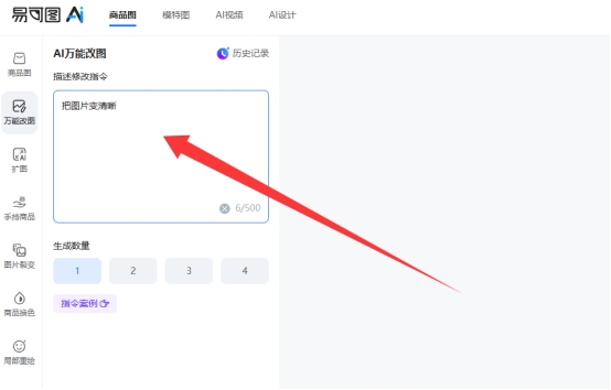 如果希望快速改善模糊文字,易可图提供的 AI 万能改图功能是一个较为直接的方案。它支持通过输入指令完成图像优化,包括清晰度修复、细节增强等处理,适用于扫描件、拍照资料或电商素材文字优化场景。