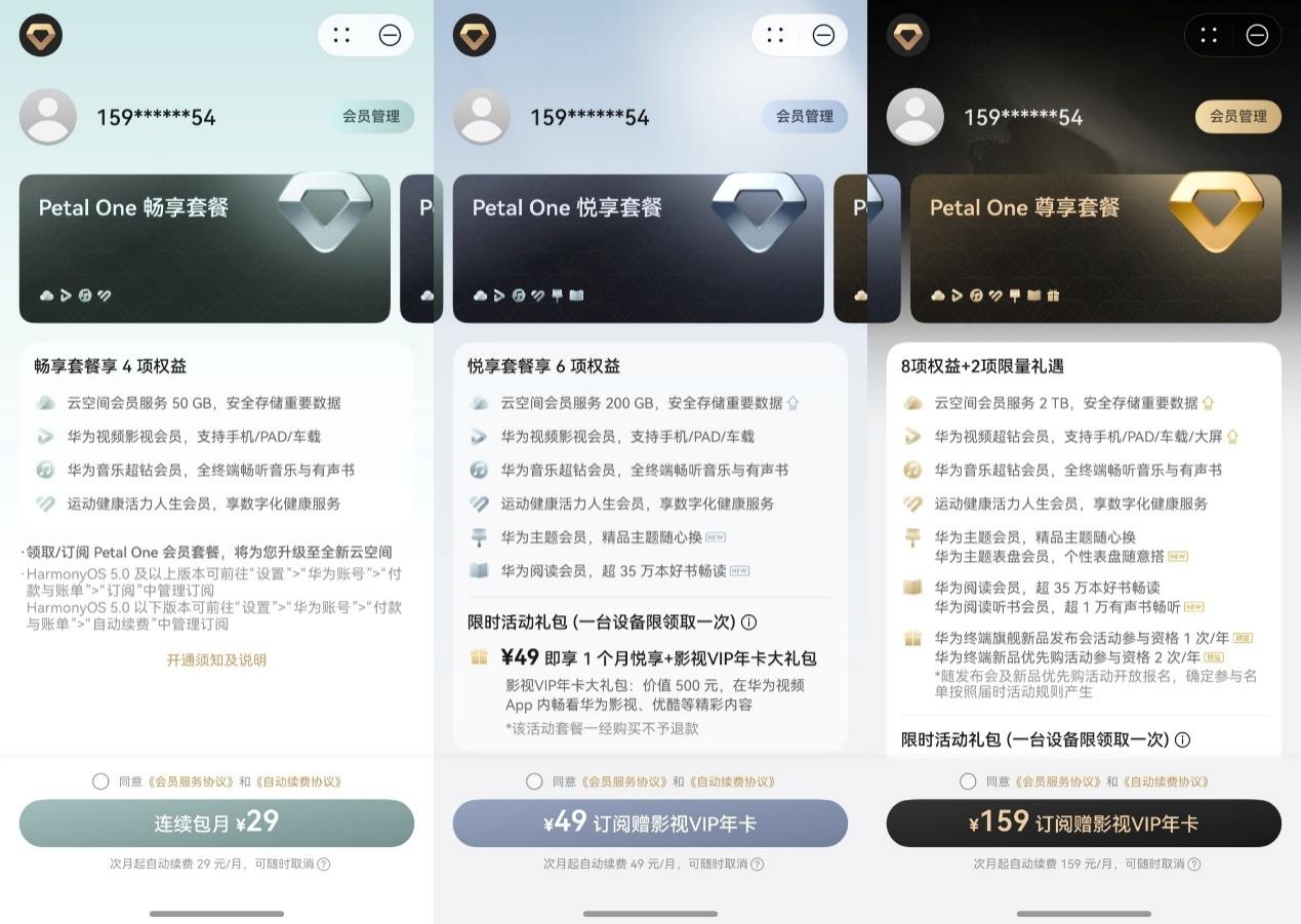 最后,还有一个重磅消息要同步给华为手机用户们。如果你暂时没有购买新机的计划,那页可以去负一屏搜索“Petal One或大会员”进入订阅,有三档套餐可供选择:畅享套餐(基础版,29元/月)、畅享套餐(全面版,49元/月)和尊享套餐(尊享版,159元/月),比各个会员单独订阅的价格省下一半。