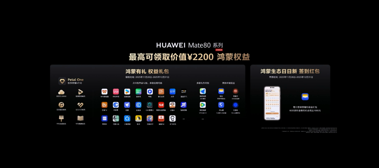 华为Mate 80系列新机鸿蒙有礼,最高领取价值2200元的新机专属福利,其中包含的6个月的Petal One悦享套餐,让你实现影音娱乐、阅读、主题和运动健康、手机存储等会员自由。