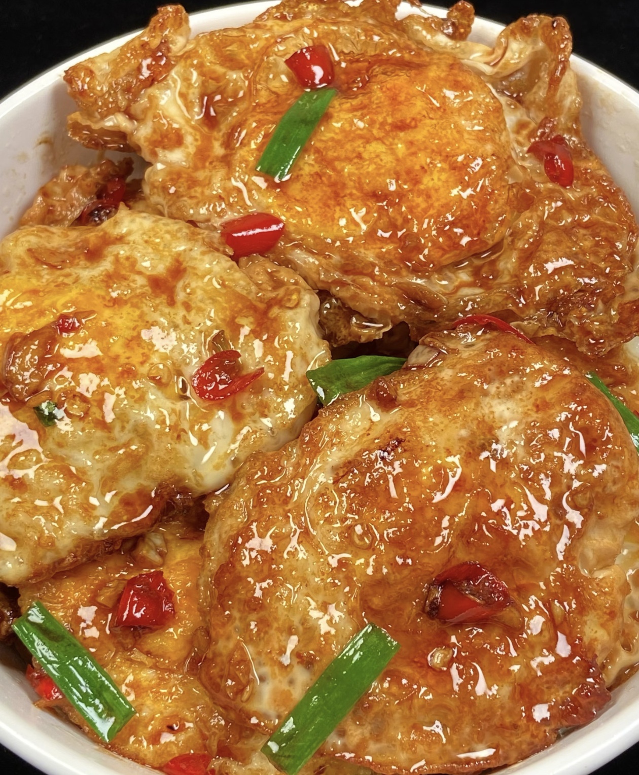 最后一步,就是出锅前撒上一把新鲜的葱段,既能提香又能点缀颜色,让这道菜看起来更加诱人。这时候的鸡蛋,外皮焦香酥脆,内里嫩滑多汁,每一口都裹满了酸辣开胃的酱汁,吃起来又香又辣,越吃越上瘾,简直是下饭界的天花板!