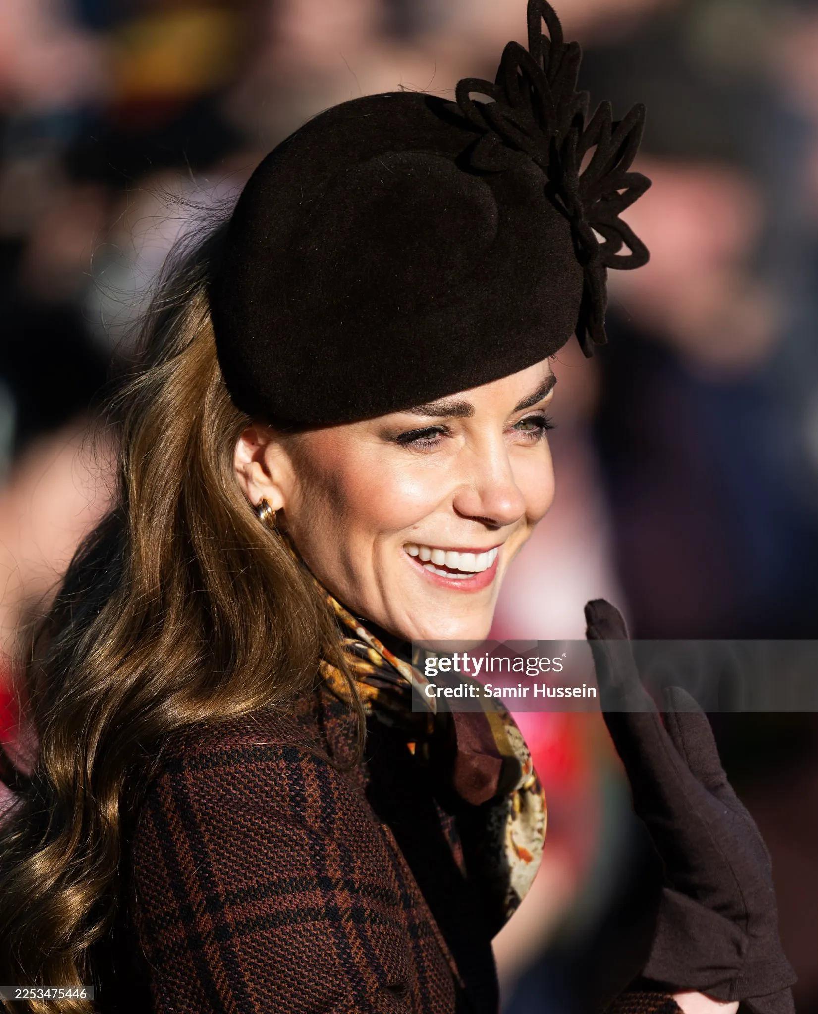 凯特王妃穿了件棕色系的格子大衣,脖颈处搭配了同色系的丝巾,一顶黑色礼帽,凯特穿衣一贯是简洁大方得体,又不失优雅!