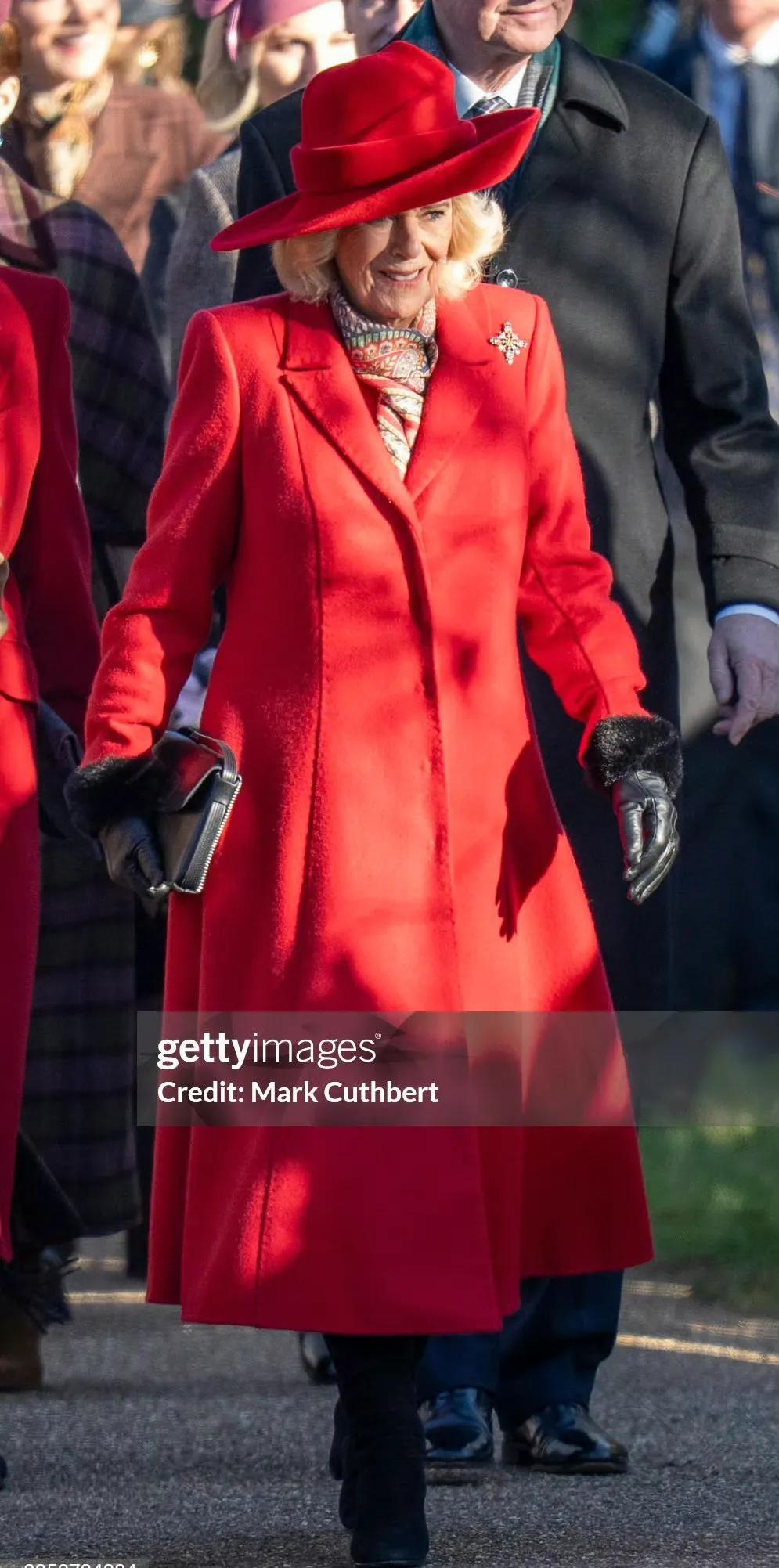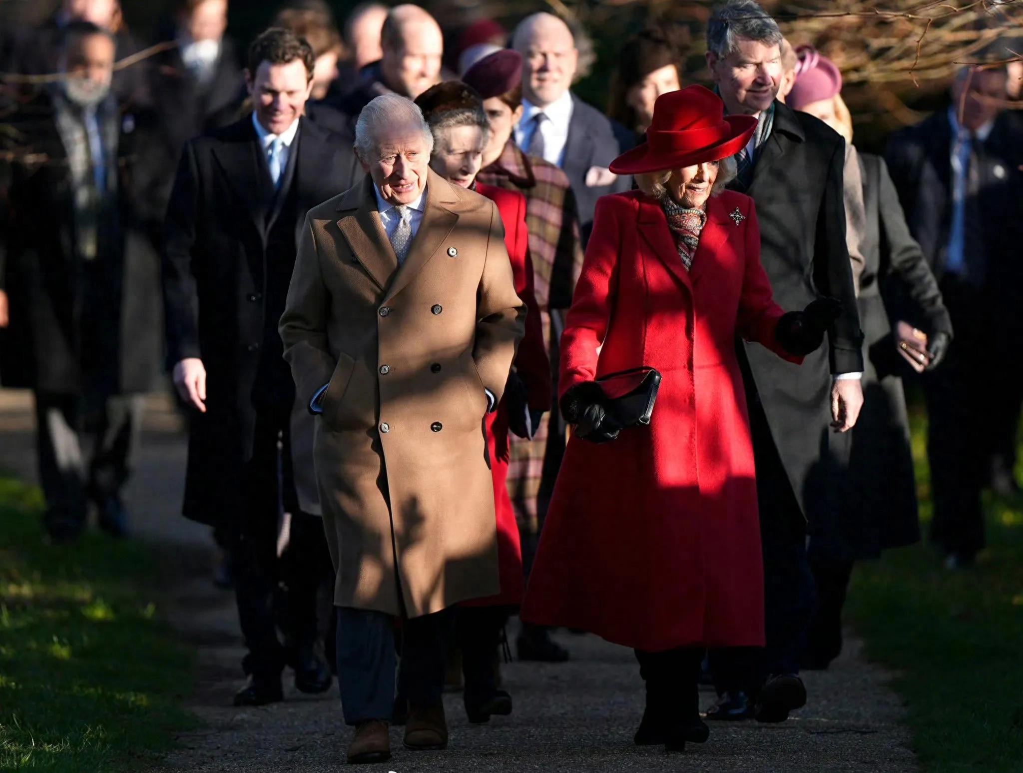 查尔斯三世和妻子卡米拉王后看起来精神矍铄,尤其是卡米拉王后,一袭大红色长大衣搭配同色礼帽,把圣诞节的热闹气氛拉满。