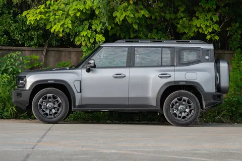 车身颜色选择也不少,有公路灰、雪山银、极夜黑及冰川白色,其他车型还有个性十足的越野色系,满足不同消费者的个性化审美需求。另外,这款车的行李架是全系标配,不仅好看,还能加装车顶帐篷或储物箱,对于喜欢户外出行的人来说很实用,车门把手是外露式设计,开门时的手感很扎实,细节处都透着硬派气质。