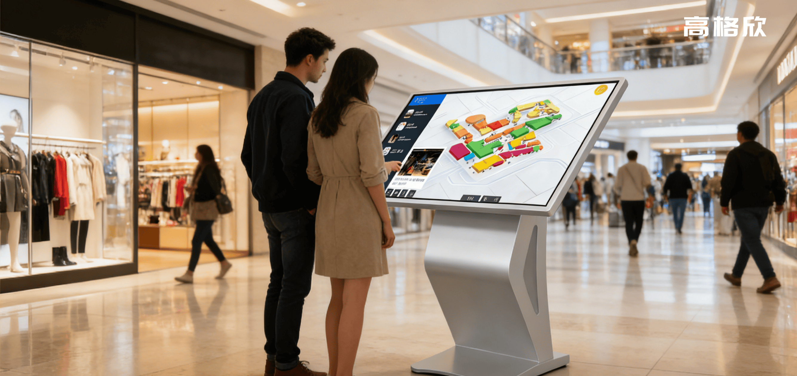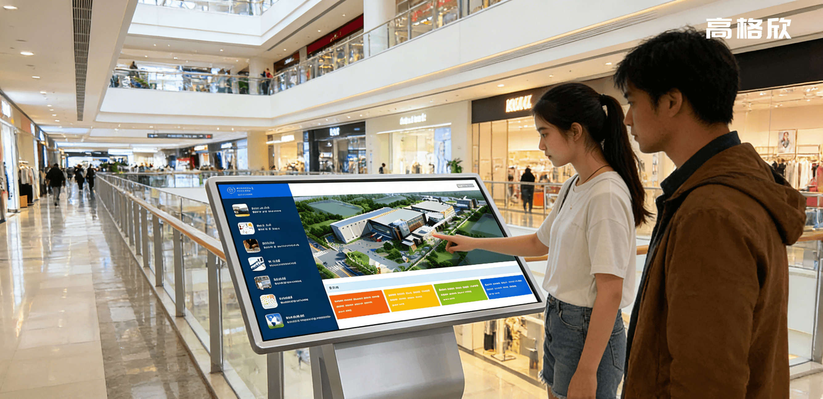 文旅场景的核心痛点是“路线复杂易迷路、文化信息传递碎片化、服务设施查找不便”,高格欣卧式触控一体机针对性破解这些难题,结合文旅场景特性进行专项优化。设备搭载GPS+北斗双模定位模块(室内场景适配蓝牙Beacon辅助定位),定位精度达±30cm,可精准识别景点、卫生间、母婴室、出入口等关键位置,游客通过触控操作即可快速查询路线,生成含文字、图标、语音提示的多维导航指引,明确标注转弯点、休息区位置,即使在景区山林、展馆遮挡区域,也能保持定位稳定,彻底解决游客迷路问题。