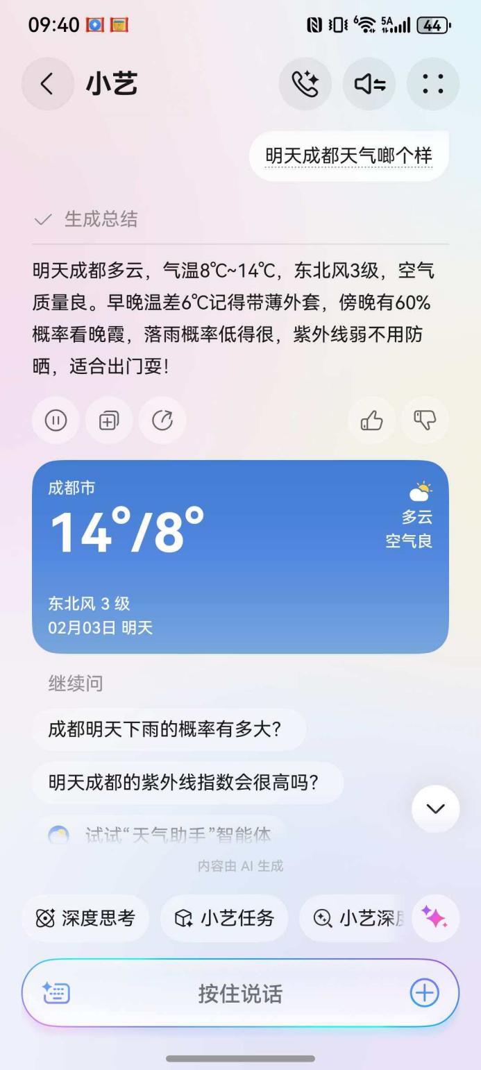 老爸之前用手机查天气、设闹钟,他总得说那口“川普播音腔”,语音助手理解不了。但这次不一样了!当老爸开口问:“明天成都天气啷个样?”小艺用地道的四川话秒回,甚至连屏幕上的对话都是川味。老爸笑得合不拢嘴,直夸小艺是标准的“川娃子”。