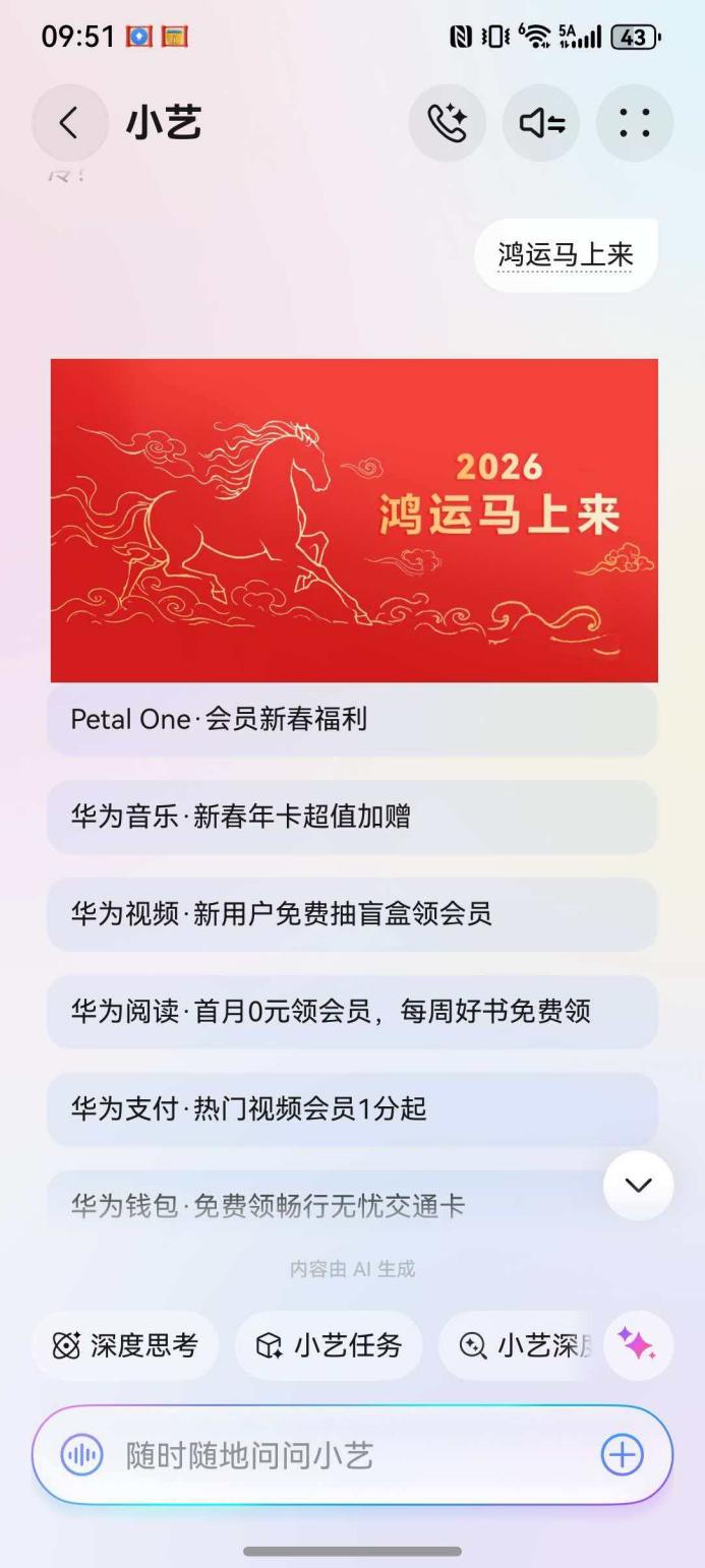更妙的是,这句“鸿运马上来”成为了开启惊喜的“口令”。现在对着小艺说出这句话,还能直接触发华为自有应用的各种新春福利活动。