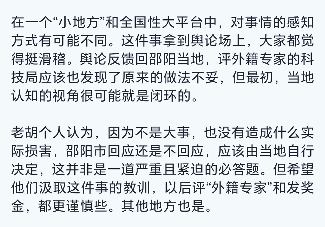 老胡把评奖的原因归纳为邵阳这种小地方对外国人的感知和大城市不一样,情有可原。