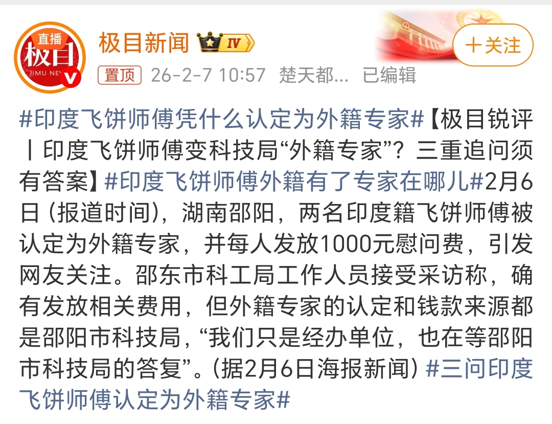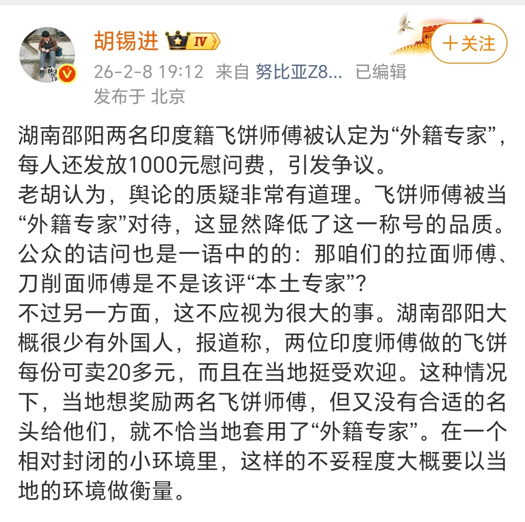 总的来看,老胡认为湖南邵阳认定印度籍飞饼师傅为“外籍专家”不是大事,大家没必要那么较真,乐呵乐呵就得了,何必纠着不放?