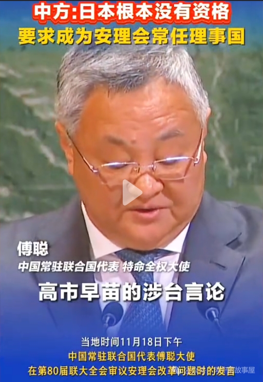 10月18日,中国驻联合国代表傅聪在第80届联合国大会全体会议审议安理会改革问题时表示,日本首相高市早苗近期在国会发表的言论极其错误,极为危险粗暴干涉中国内政,严重违背了一个中国原则和中日四个文件精神,是对国际正义的挑衅,对战后国际秩序的破坏,对国际关系基本准则的践踏,公然违背了日本所做的走和平道路的基本承诺。这样的国家根本没有资格要求成为安理会常任理事国。