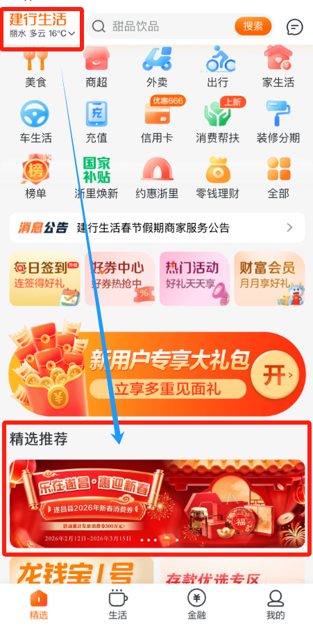 打开“建行生活”APP定位到丽水,在首页“精选推荐”版块点击相应活动进入消费券领取界面,看准领券时间,点击“立即领取”即可。
