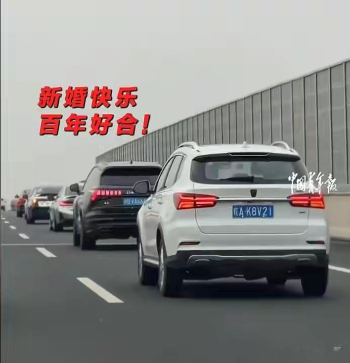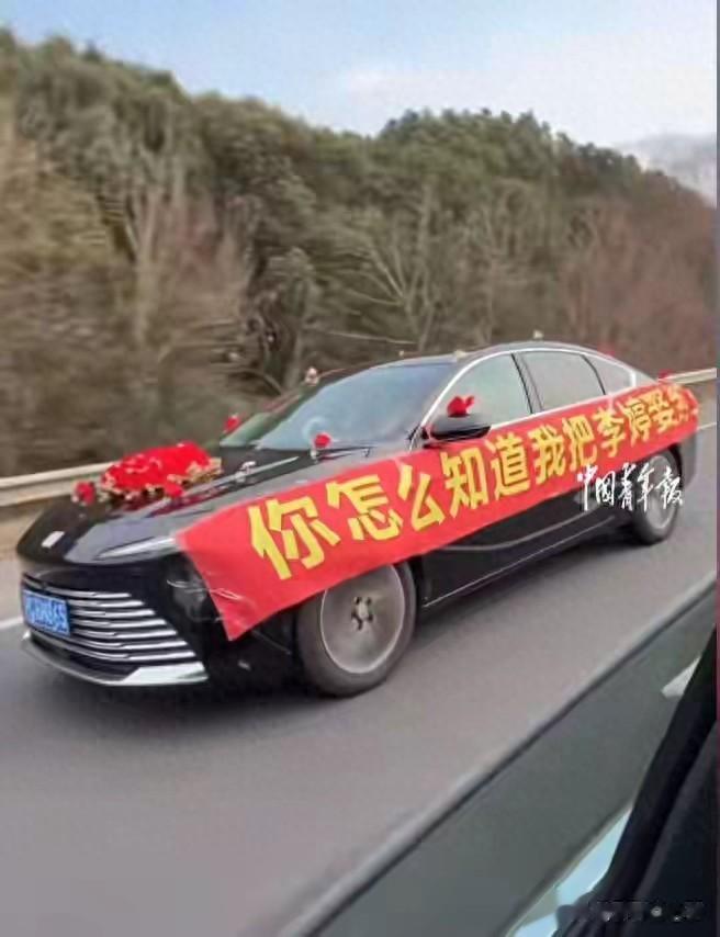 一位车主正开着车,余光扫到旁边车道——一辆白色别克,车头别着红花,车尾贴着横幅,上面写着: