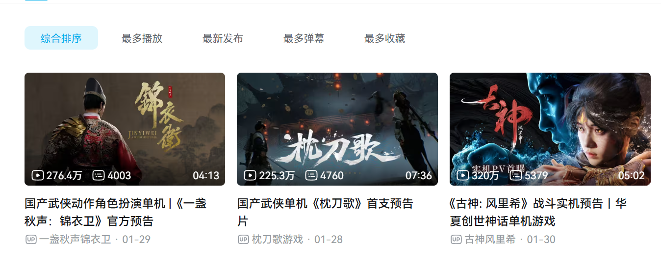 现在,只要你在某破站上面搜索国产游戏,就会弹出一大堆的国产单机游戏的预告视频,最近的比如一盏秋声:锦衣卫》,再比如枕刀歌等,都是以古风为背景,以国人所熟悉的武侠或者仙侠叙事为基础。看完预告之后,我会觉得特效确实不错,画面也很不错,玩法也比较有意思。